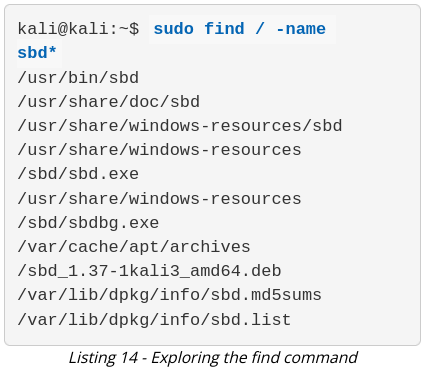 The find command3 is the most complex and flexible search tool among the three. Mastering its syntax can sometimes be tricky, but its capabilities go beyond a normal file search. The most basic usage of the find command is shown in Listing 14, where we perform a recursive search starting from the root file system directory and look for any file that starts with the letters "sbd".