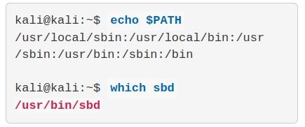 The which command1 searches through the directories that are defined in the $PATH environment variable for a given file name. This variable contains a listing of directories that Kali searches when a command is issued without its path. If a match is found, which returns the full path to the file as shown below: