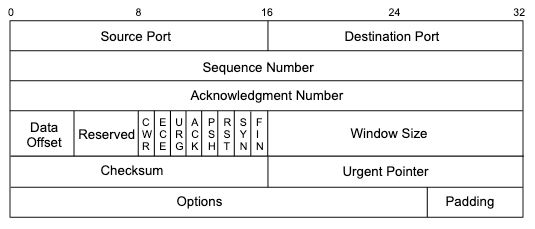 The following diagram depicts the TCP header and shows that the TCP flags are defined starting from the 14th byte.