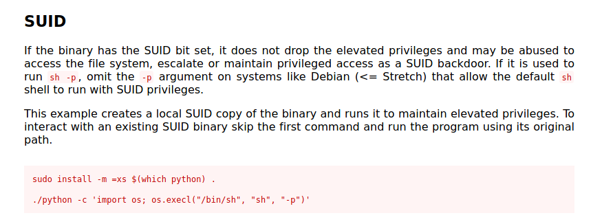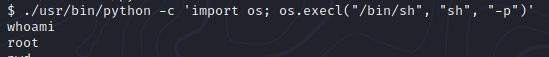 In here we see that /usr/bin/python can be executed as root. Let's exploit that with GTFOBins.