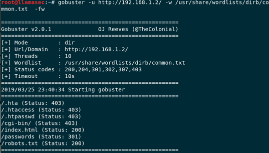 GoBuster scans the most common directories which are used on a WebApp / Website. To run this scan GoBuster needs to be installed first: sudo apt-get install gobuster
