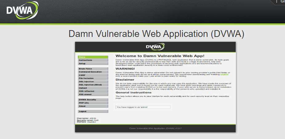 Damn Vulnerable Web App (DVWA) is a PHP/MySQL web application that is damn vulnerable. Its main goals are to be an aid for security professionals to test their skills and tools in a legal environment, help web developers better understand the processes of securing web applications and aid teachers/students to teach/learn web application security in a class room environment.